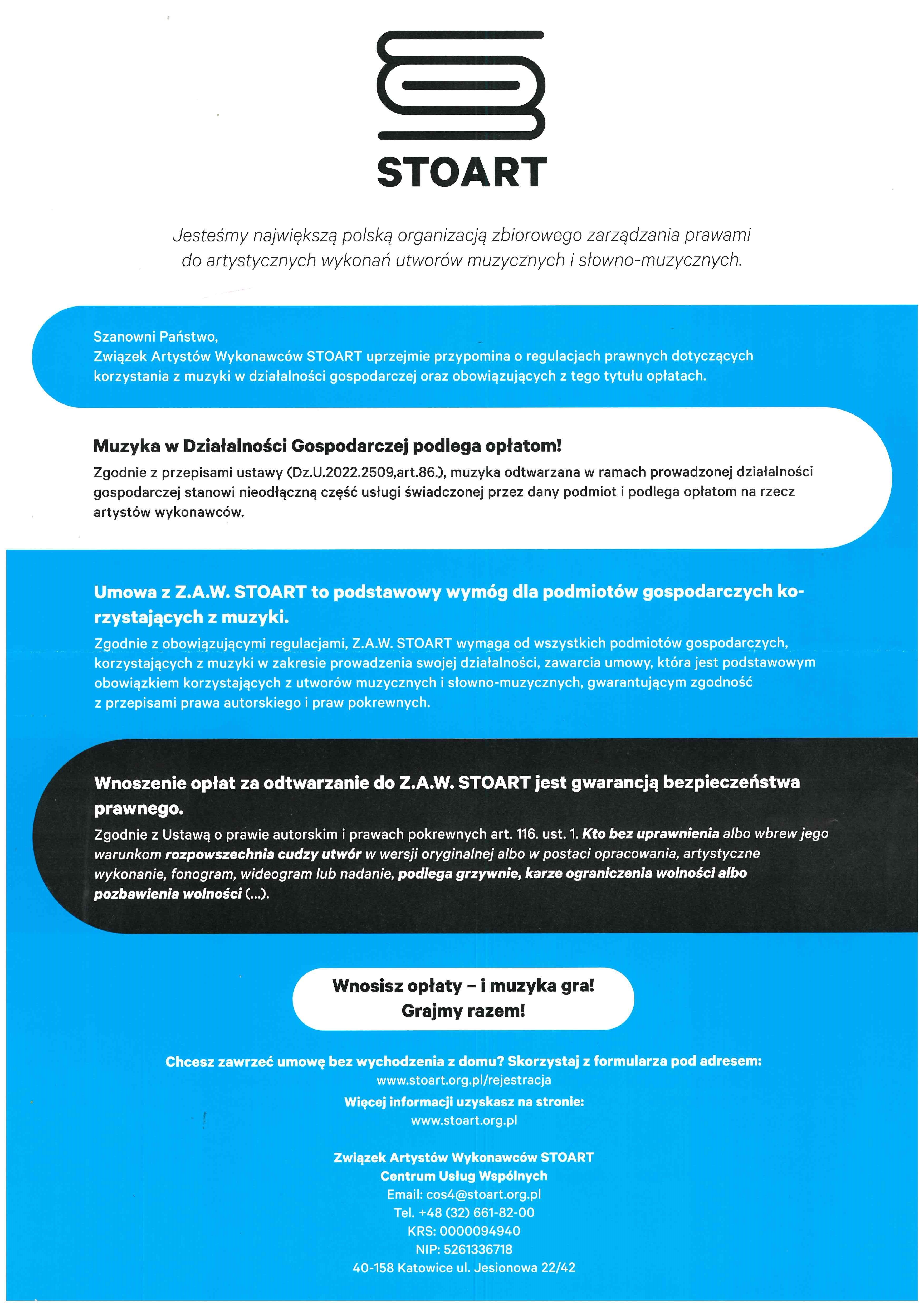 Zgodnie z przepisami ustawy (Dz.U.2022.2509,art.86.), muzyka odtwarzana w ramach prowadzonej działalności gospodarczej stanowi nieodłączną część usługi świadczonej przez dany podmiot i podlega opłatom na rzecz artystów wykonawców.