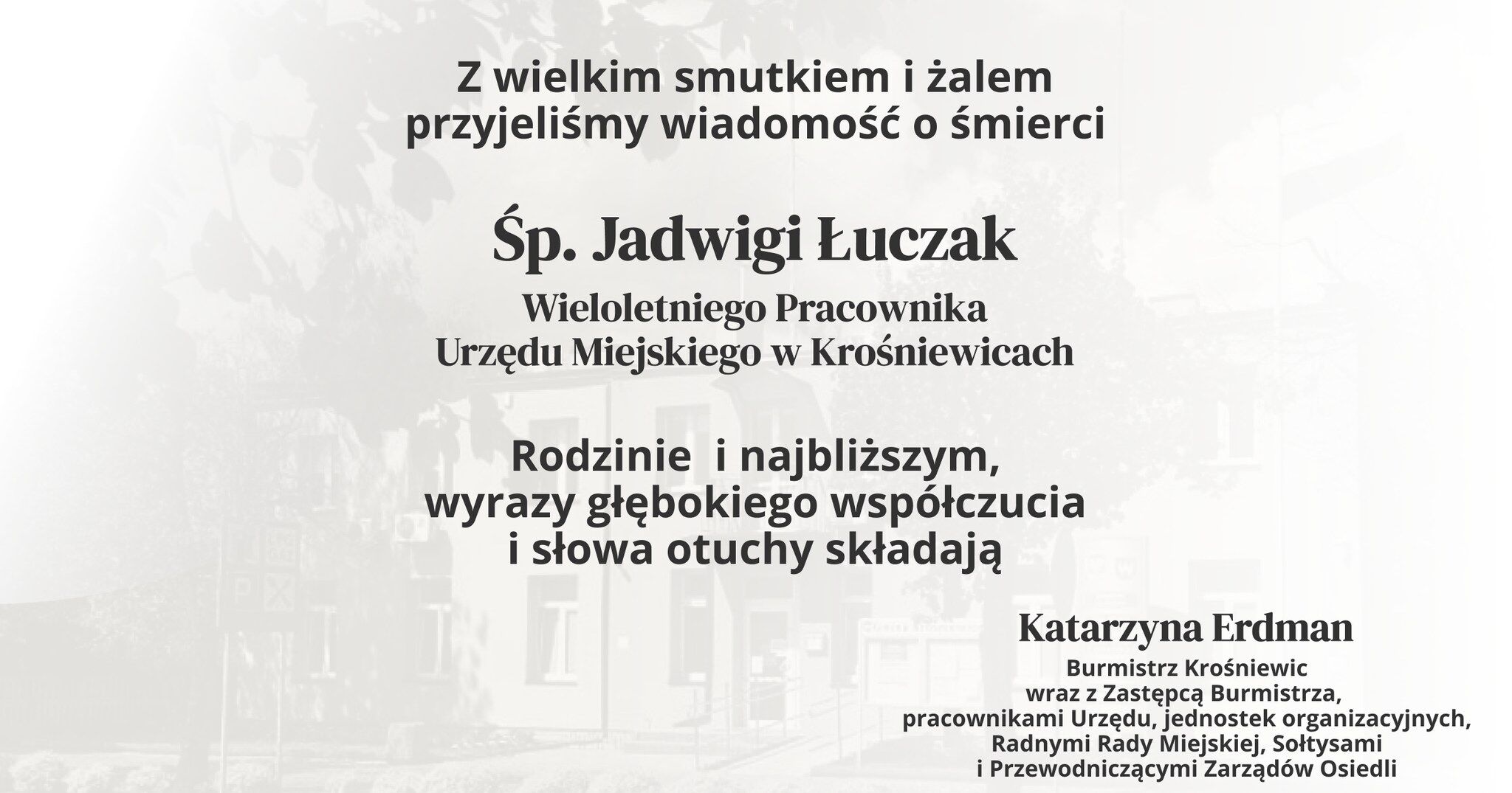 Rodzinie i najbliższym, wyrazy głębokiego współczucia i słowa otuchy składają Katarzyna Erdman - Burmistrz Krośniewic, wraz z Zastępcą Burmistrza, pracownikami Urzędu, jednostek organizacyjnych, Radnymi Rady Miejskiej, Sołtysami i Przewodniczącymi Zarządów Osiedli.
