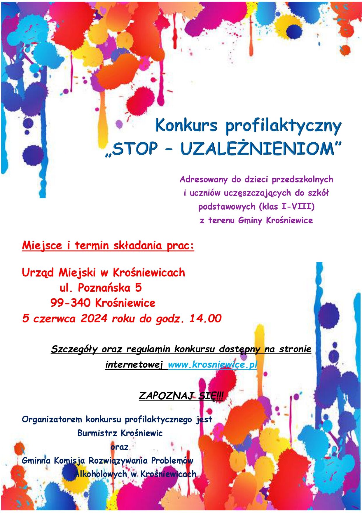 7. Prace konkursowe należy składać wraz z oświadczeniem oraz obowiązkiem informacyjnym (w załączniku) w Urzędzie Miejskim w Krośniewicach (ul. Poznańska 5) w Sekretariacie Urzędu do 5 czerwca 2024 roku do godziny 14.00.