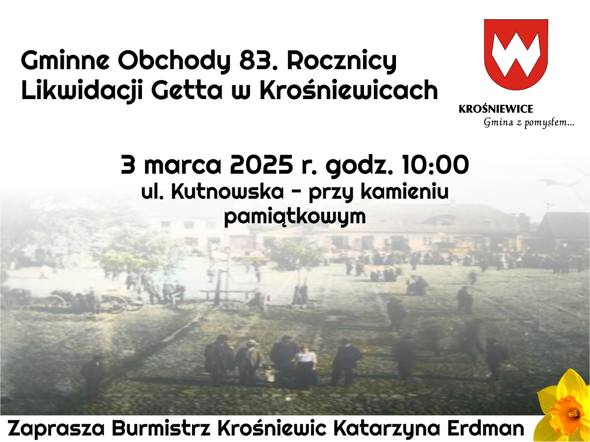 Burmistrz Krośniewic Katarzyna Erdman zaprasza wszystkich mieszkańców na Gminne obchody 83. rocznicy likwidacji getta w Krośniewicach. Wydarzenie odbędzie się 3 marca 2025 roku o godzinie 10:00 przy kamieniu pamiątkowym na ul. Kutnowskiej. Wspólnie oddajmy hołd ofiarom tragicznych wydarzeń z okresu II wojny światowej, upamiętniając historię naszej społeczności.