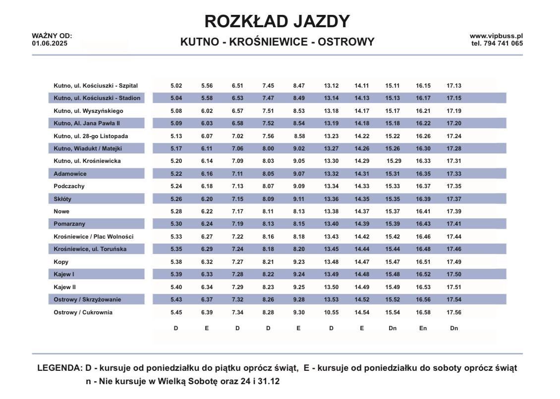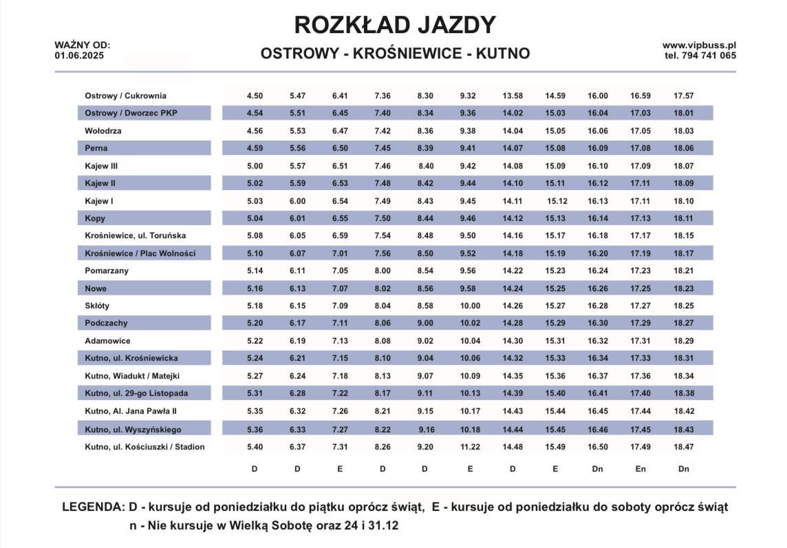 Otrzymaliśmy informację od przewoźnika VIP-BUSS Jan Kowalski o zmianie rozkładu jazdy busów na liniach komunikacyjnych Ostrowy - Kutno przez Krośniewice oraz Kutno - Ostrowy przez Krośniewice. Aktualne rozkłady jazdy w treści artykułu.