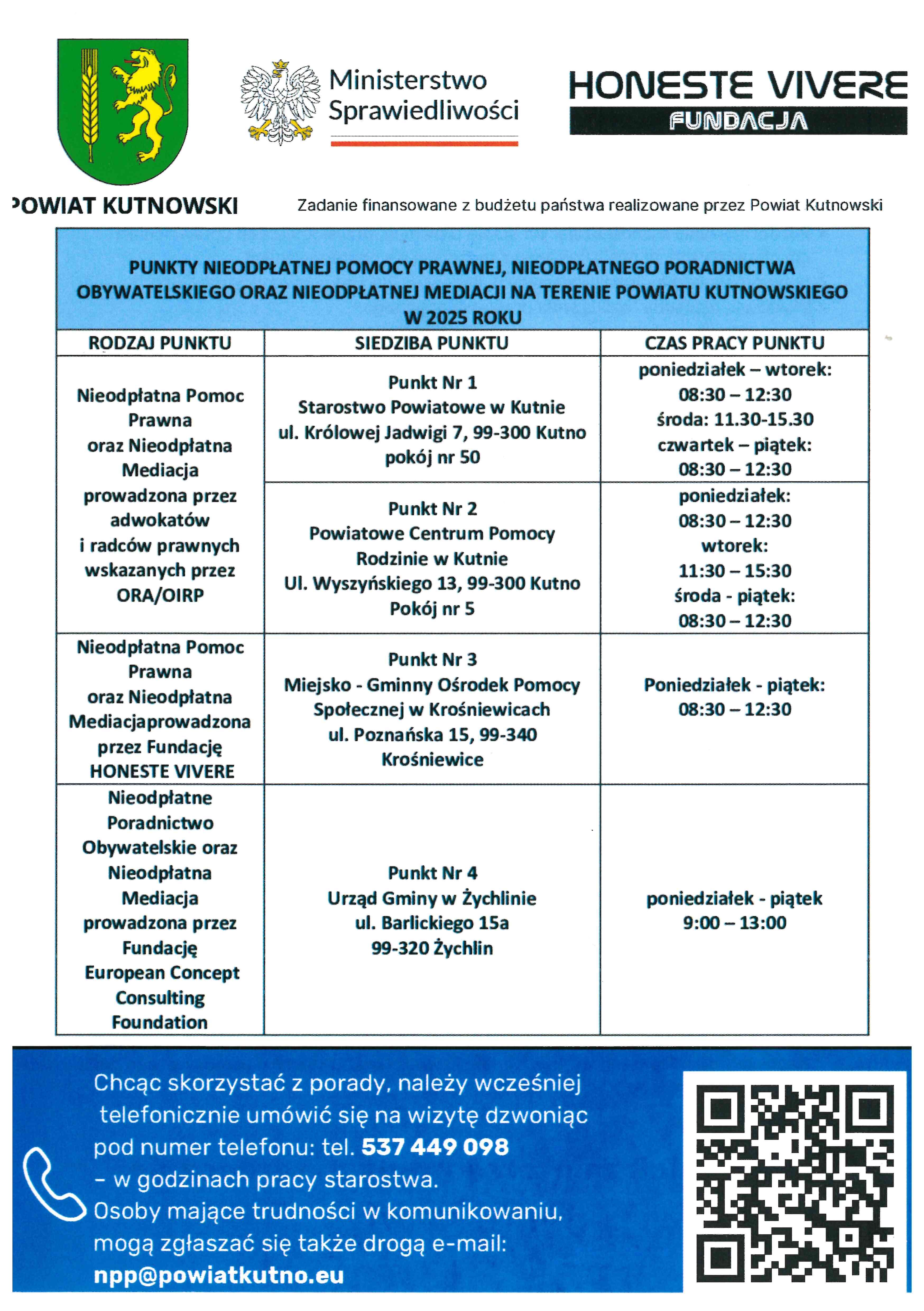 Punkty nieodpłatnej pomocy prawnej, nieodpłatnego poradnictwa obywatelskiego oraz niedopłatnej mediacji na terenie powiatu kutnowskiego w 2025 roku