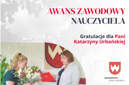 Pani Katarzyna Urbańska - nauczycielka ze Szkoły Podstawowej im. Władysława Andersa w Nowem, po spełnieniu wszystkich wymaganych przepisami prawa oświatowego formalności oraz pozytywnym zdaniu egzaminu przed komisją egzaminacyjną, odebrała z rąk Burmistrz Krośniewic – Pani Katarzyny Erdman – akt nadania awansu na stopień nauczyciela mianowanego.