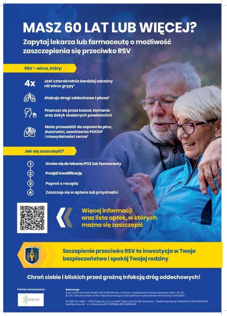 W ramach kampanii edukacyjnej prowadzonej w związku z w projektem Zdrowie Człowiek Profilaktyka oraz Ogólnopolskim Programem Zwalczania Chorób Infekcyjnych (OPZCI) przekazujemy informacje na temat profilaktyki zakażeń wirusem RSV, w tym dostępnych – również bezpłatnych – możliwości szczepień