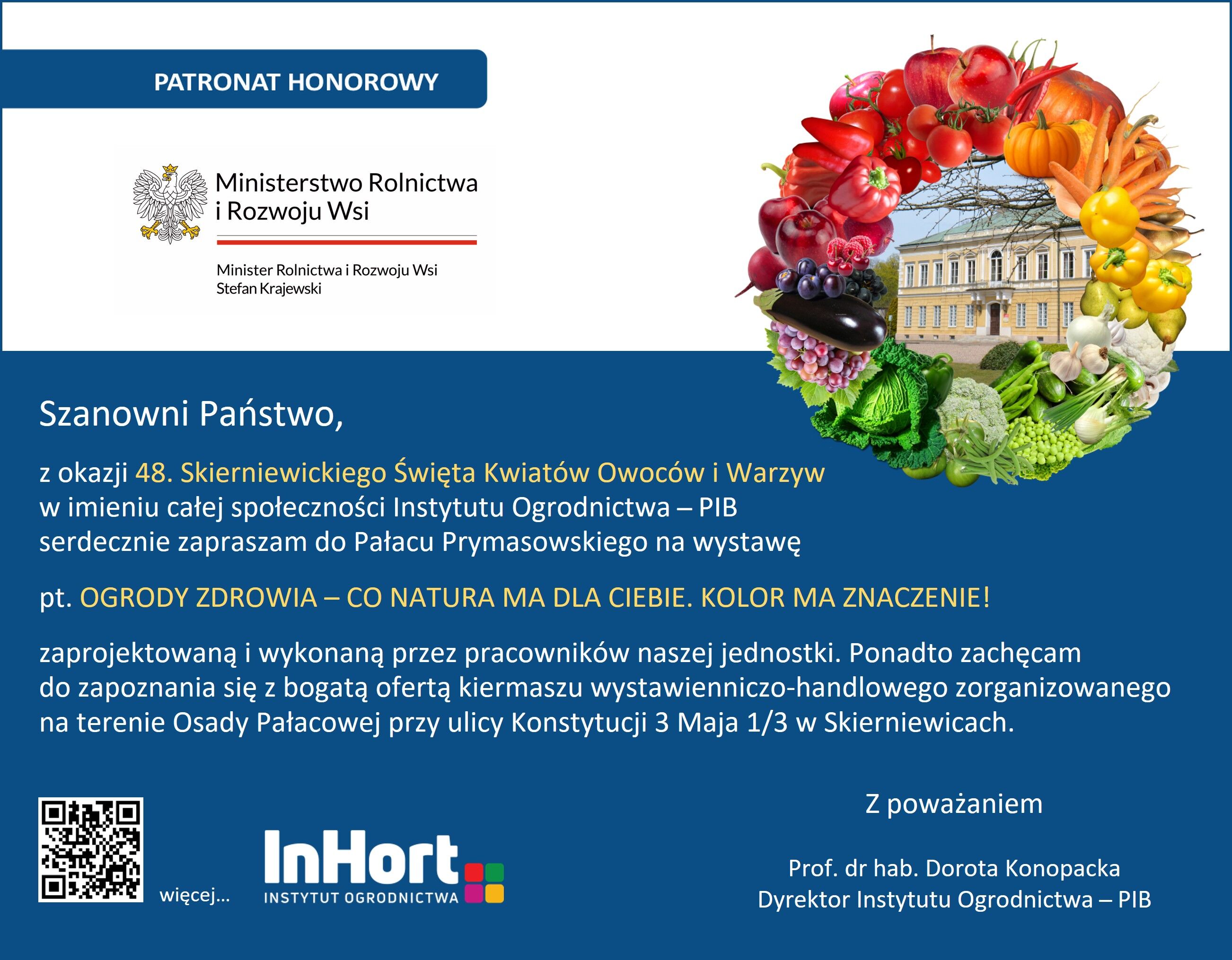 Byłoby nam niezwykle miło, gdyby zechcieli Państwo zarezerwować sobie ten termin w kalendarzu i spotkać się z nami w Skierniewicach. Wystawa to wyjątkowa okazja, by odkryć, jak barwy roślin wpływają na zdrowie i samopoczucie, a także poznać najnowsze osiągnięcia Instytutu Ogrodnictwa – PIB.