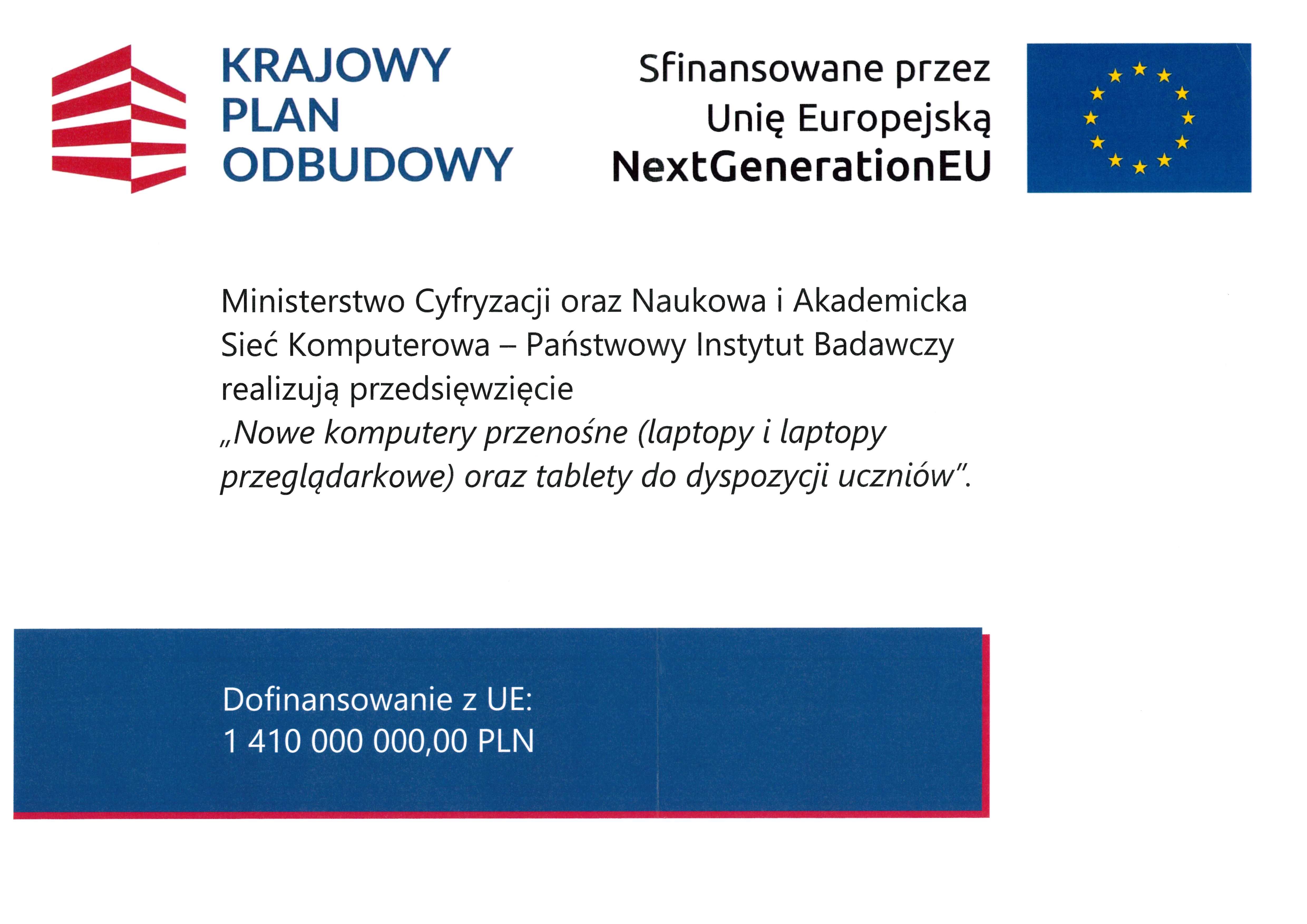 Niniejsze zadanie realizowane jest w ramach inwestycji C2.2.1 Wyposażanie szkół / instytucji w odpowiednie urządzenia i infrastrukturę ICT w celu poprawy ogólnej wydajności systemów edukacji Krajowego Planu Odbudowy i Zwiększenia Odporności (KPO).