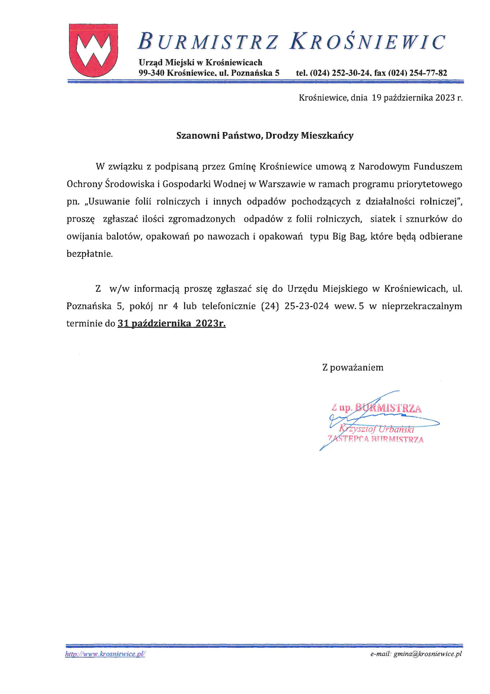 Z w/w informacją proszę zgłaszać się do Urzędu Miejskiego w Krośniewicach, ul. Poznańska 5, pokój nr 4 lub telefonicznie (24) 25-23-024 wew. 5 w nieprzekraczalnym terminie do 31 października 2023r.